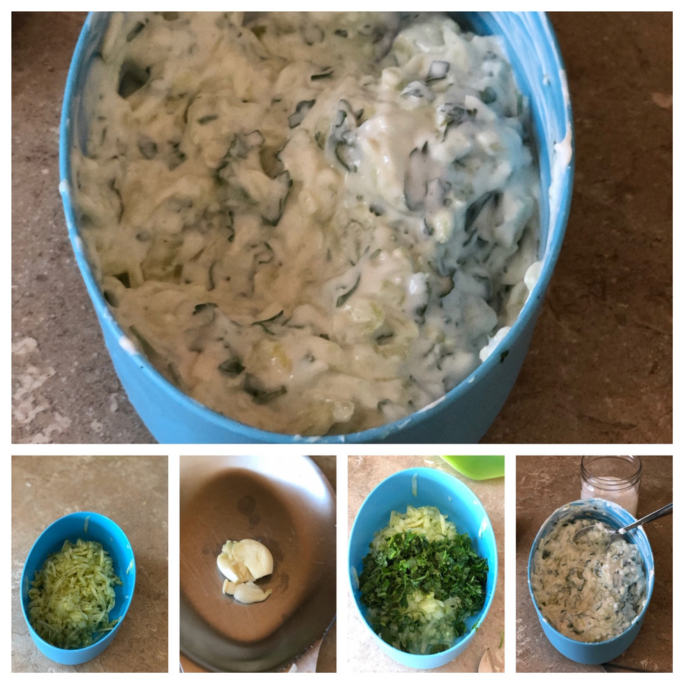 In a bowl add in the greek yogurt, cucumbers shredded, garlic, parsley and sea salt. Mix well with a spoon or a whisk and cover it and put in the fridge till you need to assemble the gyros.