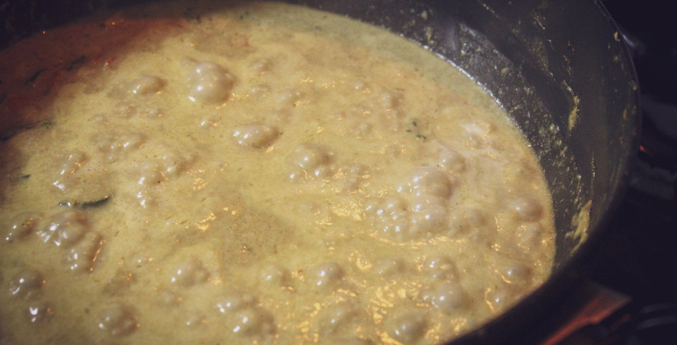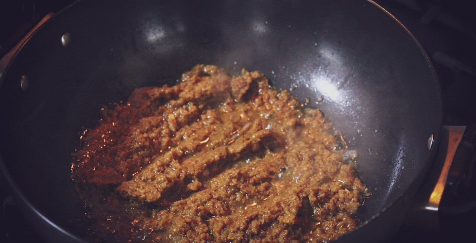 *Take a pan and heat oil in it. Add the curry paste and cook for 5-6 mins on medium heat. Keep stirring so it doesn't burn and stick to the pan.