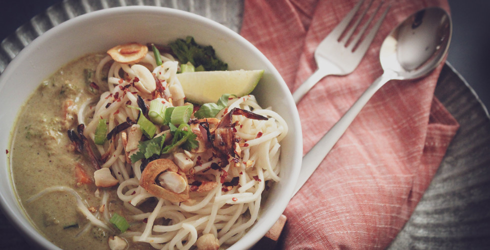 This Burmese dish has been adapted in various countries each with a unique style of making this one pot comforting noodle soup. While the signature dish is made from rice noodles and yellow or massaman thin curry my version is little bit more Indian Style (cuz FUSION is my thing nowadays).
